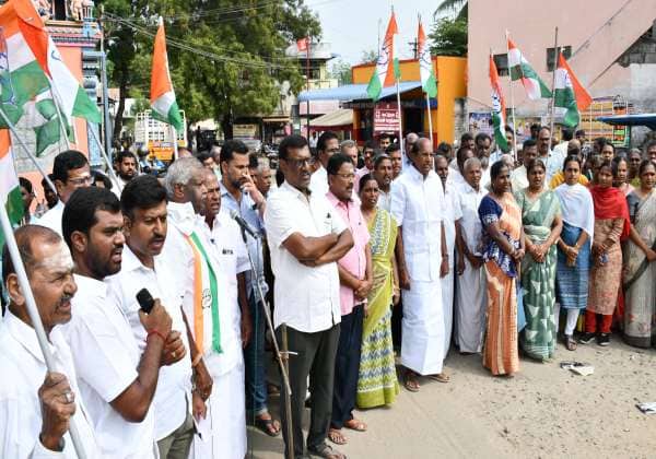 திருப்பூர் மாநகராட்சி சொத்துவரி உயர்வை கண்டித்து காங்., சார்பில் நல்லூர் பஸ் ஸ்டாப்பில் ஆர்ப்பாட்டம் நடந்தது.
