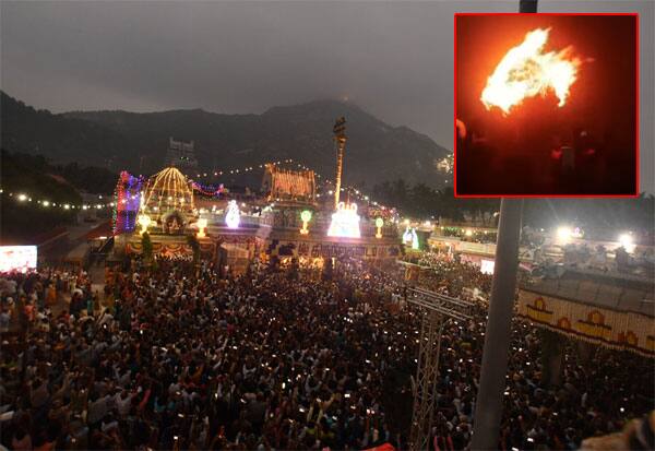 திருவண்ணாமலை அருணாச்சலேஸ்வரர் கோவிலில் கார்த்திகை தீபத் திருவிழா பத்தாம் நாளில் 2668 அடி உயரமுள்ள அண்ணாமலையார் மலையில் ஏற்றப்பட்ட தீபத்தை கோவில் கொடிமரம் அருகேயிருந்து தரிசித்த பக்தர்கள்.