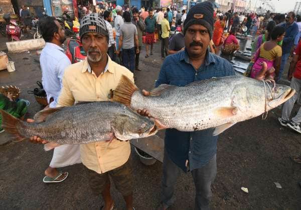 சென்னை, காசிமேடு மீன் பிடி துறைமுகத்தில் விசைப்படகுகளில் பிடித்து வரப்பட்ட கொடுவா மீன்.
