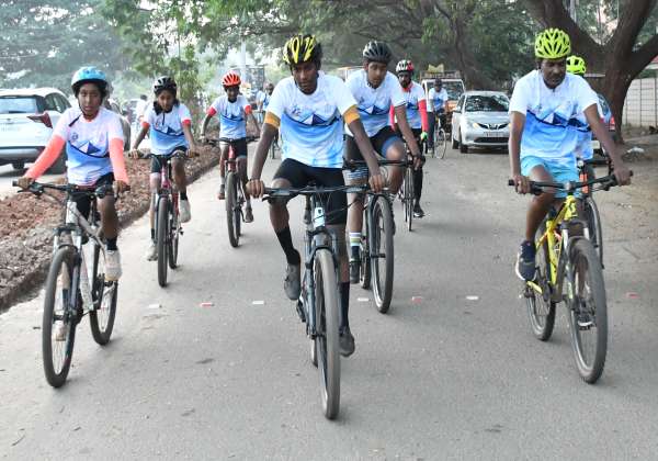 விழிப்புணர்வு சைக்கிள் பேரணியில் கலந்து கொண்ட தன்னார்வலர்கள். இடம்: கோவைப்புதூர்