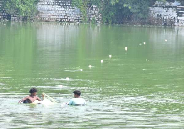 தண்ணீர் அதிகரித்துள்ள சிவகங்கை தெப்பக்குளத்தில் ஆபத்தை உணராமல் மீன்பிடிக்கும் இளைஞர்கள்.
