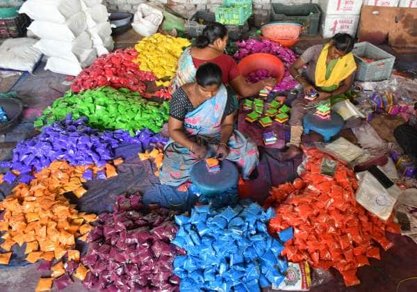 மார்கழி மாதம் துவங்கவுள்ள நிலையில் தூத்துக்குடி மாவட்டம் பொன்னங்குறிச்சி பகுதியில் விற்பனைக்காக தயாராகும் வண்ண கோலப் பொடிகள்..