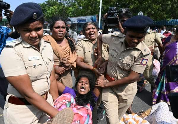 துப்புரவு பணியாளர்கள் சென்னையில் மறியல் போராட்டத்தில் ஈடுபட்டனர். ஈடுபட்டவர்களை போலீசார் கைது செய்தனர். இடம்: மெரினா காமராஜர் சாலை கருணாநிதி நினைவிடம் முன்பு.