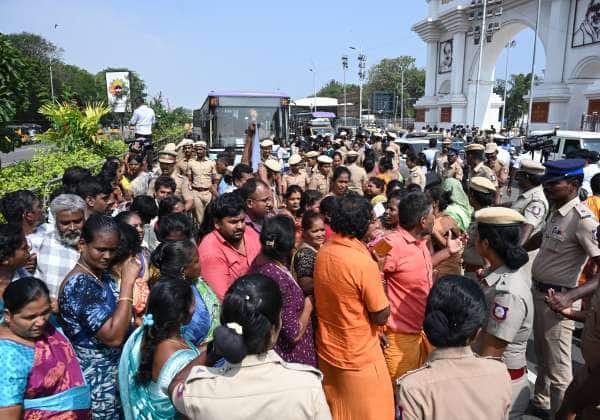 துப்புரவு பணியாளர்கள் சென்னை மெரினா காமராஜர் சாலையில் உள்ள கருணாநிதி நினைவிடம் முன்பு மறியல் போராட்டத்தில் ஈடுபட்டனர். ஈடுபட்டவர்களை கைது செய்து அழைத்துச் சென்ற போலீசார்.