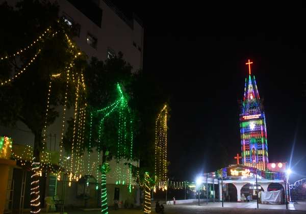 கிறிஸ்துமஸ் பண்டிகையை ஒட்டி, திருப்பூர் குமரன் ரோடு, கத்ரீனா சர்ச் வளாகம் முழுவதும் வண்ண விளக்குகளால் அலங்காரம் செய்யப்பட்டிருந்தது.