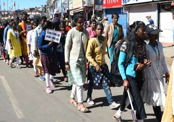ஊட்டியில், போலீசாரால் நடத்தப்பட்ட போதை பொருள் தடுப்பு விழிப்புணர்வு ஊர்வலத்தில் கலந்துக்கொண்டா மாணவிகள்.
