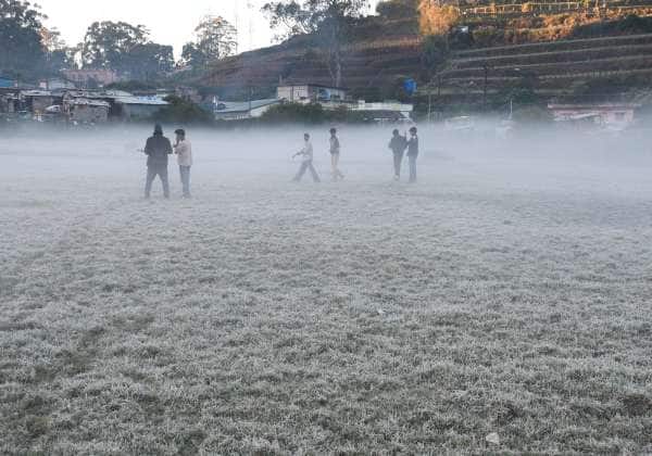 ஊட்டி காந்தள் பகுதியில், கொட்டி கிடக்கும் உறைபனியில், படம் எடுக்கும் சுற்றுலா பயணிகள் .