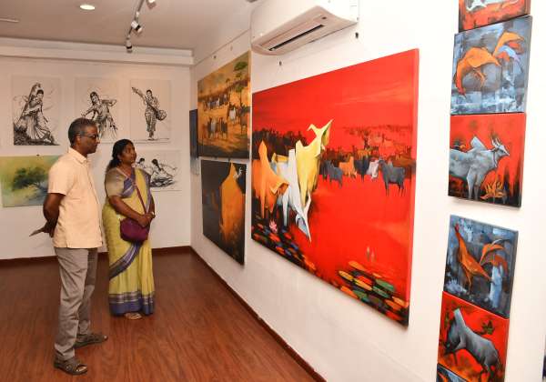 சென்னை நுங்கம்பாக்கத்தில் நடந்த மாஸ்டர் டிசைப்பிள் எனும் ஓவிய கண்காட்சியை பார்வையிட்ட பொதுமக்கள்.