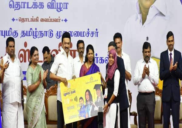 அரசு உதவிபெறும் பள்ளியில் படித்த மாணவியருக்கான புதுமைப்பெண் திட்ட விரிவாக்கத்தை முதல்வர் ஸ்டாலின் துவக்கிவைத்தார். இடம்: காமராஜ் கல்லூரி, தூத்துக்குடி.