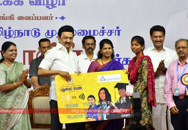 அரசு உதவிபெறும் பள்ளியில் படித்த மாணவியருக்கான புதுமைப்பெண் திட்ட விரிவாக்கத்தை முதல்வர் ஸ்டாலின் துவக்கிவைத்தார். இடம்: காமராஜ் கல்லூரி, தூத்துக்குடி.