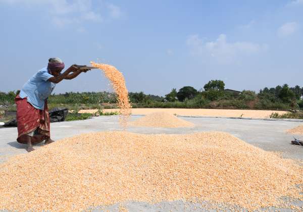 உடுமலை சின்னவீரம்பட்டியில் அறுவடை செய்யப்பட்ட மக்கச்சோள பயிரை களத்தில் காயவைத்து எடுத்து தூற்றும் தொழிலாளர் .