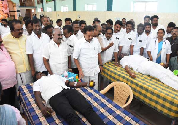 விழுப்புரம் வடக்கு மாவட்ட திமுக இளைஞரணி சார்பில் திண்டிவனம் மயிலம் முருகன் திருமண மண்டபத்தில் நடந்த ரத்த தான முகாமை அமைச்சர் பொன்முடி துவக்கி வைத்தார்.