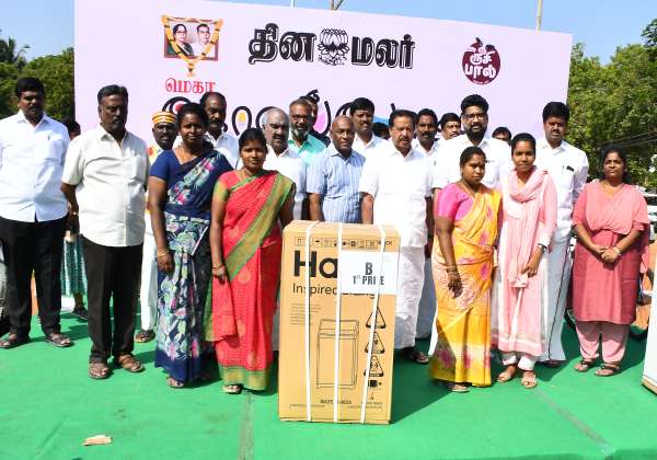 விழுப்புரம் கலெக்டர் வளாக மைதானத்தில் நடந்த தினமலர் மெகா கோலப்போட்டியில் வெற்றி பெற்றவருக்கு முதல் பரிசை வனத்துறை அமைச்சர் பொன்முடி வழங்கினார். அருகில் கலெக்டர் பழனி, தி.மு.க.,மாவட்ட செயலாளர் கவுதமசிகாமணி, மாவட்ட ஊராட்சி குழு தலைவர் ஜெயச்சந்திரன், முன்னாள் சேர்மன் ஜனகராஜ்.