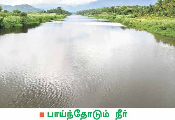 அமராவதி அணையில் இருந்து திறந்து விடப்படும் நீர், அமராவதி ஆற்றில் இரு கரைகளையும் தொட்டுச் செல்வது காண்பதற்கு ரம்யமாக உள்ளது. இடம்: உடுமலை, கல்லாபுரம்.