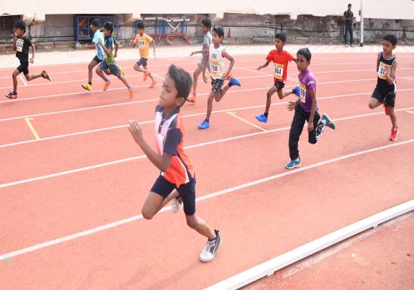 கோவை நேரு ஸ்டேடியத்தில் 100 மீட்டர் ஓட்ட பந்தயத்தில் கலந்து கொண்ட குட்டீஸ்கள்.