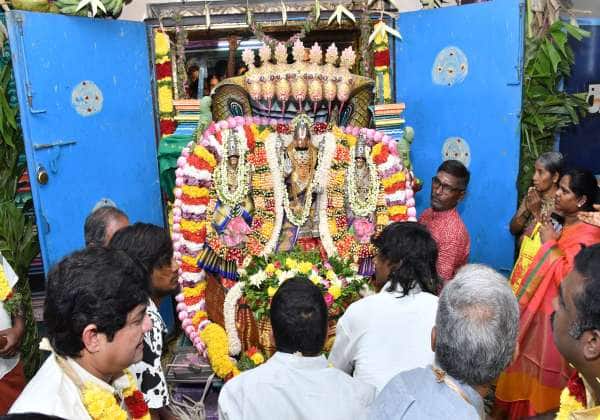 வைகுண்ட ஏகாதசியையொட்டி சொர்க்கவாசல் வழியாக சேஷ வாகனத்தில் வந்து பக்தர்களுக்கு அருள் பாலித்த கோவை கோட்டைமேடு ஸ்ரீ பூமி நீளா நாயகி சமேத கரி வரதராஜ பெருமாள்.