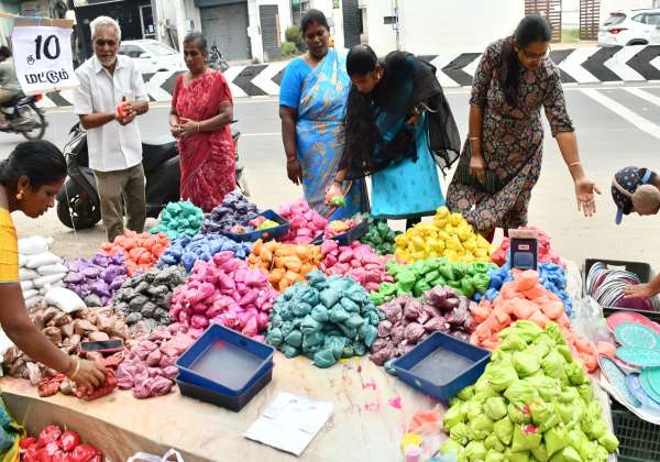 பொங்கல் பண்டிகைக்கு கலர் கோலப்பொடி விற்பனைக்கு வந்துள்ளது. இடம்: திருப்பூர், பல்லடம் ரோடு.