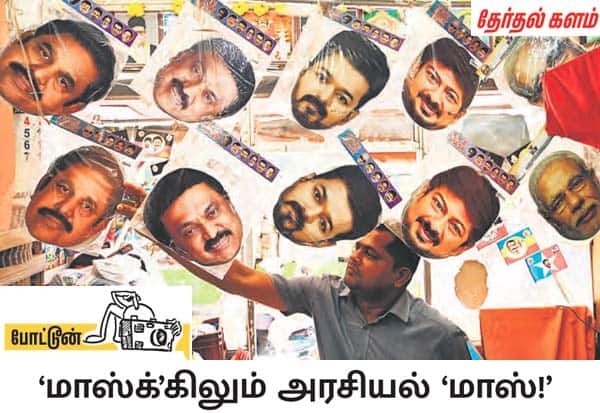 பிரசார மேடையில் தலைவர்கள் கர்ஜிப்பதற்கு முன்பே, தொண்டர்கள் தங்கள் முகத்தில் தலைவர்களை சுமக்க துவங்கிவிட்டனர். மாஸ்க்கை கழற்றினால் நான்...மாட்டிக்கொண்டால் என் தலைவர்! என்ற ரேஞ்சுக்கு கலக்கி வருகின்றன இந்த லீடர் மாஸ்க்குகள். இடம்: பிராட்வே, சென்னை.