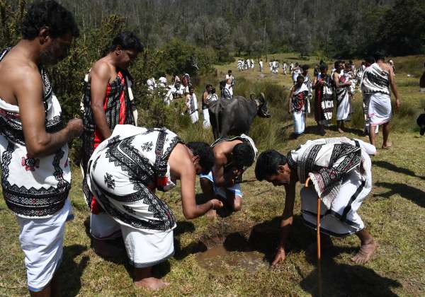 ஊட்டி தலைகுந்தா அருகே உள்ள முத்தநாடுமந்தில், நடந்த எருமைகளுக்கு உப்பு சாஸ்திரத்தில், உப்பு நீரை வணங்கிய தோடர் பழங்குடியினர்.