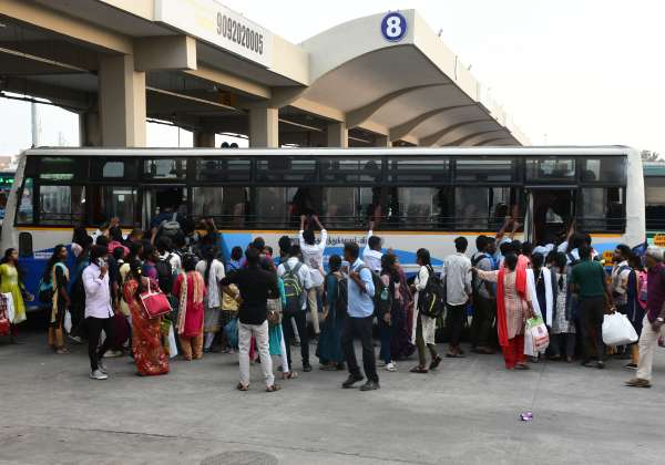 பொங்கல் பண்டிகையை கொண்டாட மக்கள் சொந்த ஊர்களுக்கு செல்வதற்காக பேருந்து நிலையத்தில் பஸ்ஸில் இடம் பிடிப்பதற்காக முண்டியடித்து ஏறினார்கள்.இடம் கிளாம்பாக்கம் பேருந்து நிலையம்