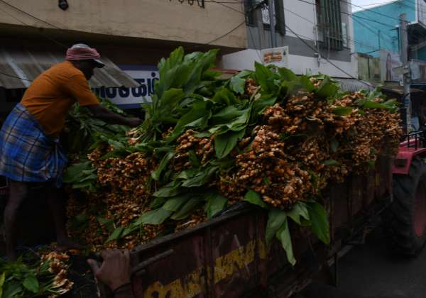 திருவள்ளூர் பஜாரில பொங்கலை முன்னிட்டு மஞ்சள் செடி விற்பனைக்கு வந்துள்ளது