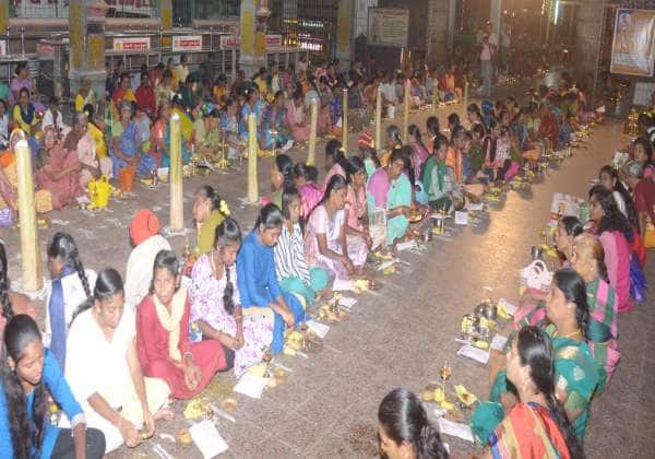 மார்கழி கடைசி நாளை முன்னிட்டு திண்டுக்கல் கோட்டைமாரியம்மன் கோயிலில் நடந்த விளக்கு பூஜையில் பங்கேற்றவர்கள்.