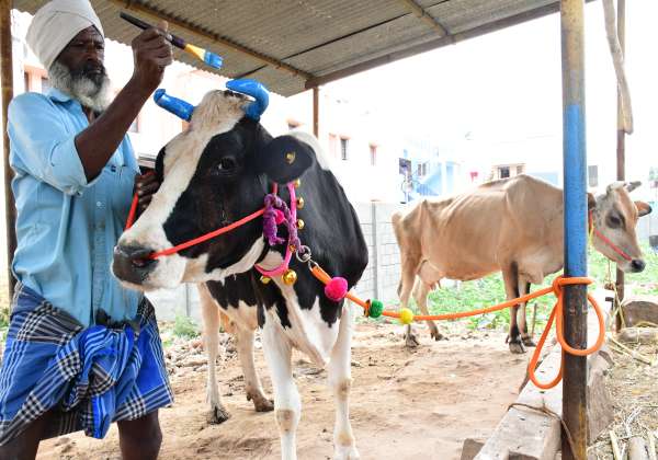 மாட்டுப் பொங்கலை ஒட்டி கோவை வேலாண்டிபாளையத்தில் கால்நடைகள் கொம்புகளுக்கு வர்ணம் பூசும் பணி நடந்தது.
