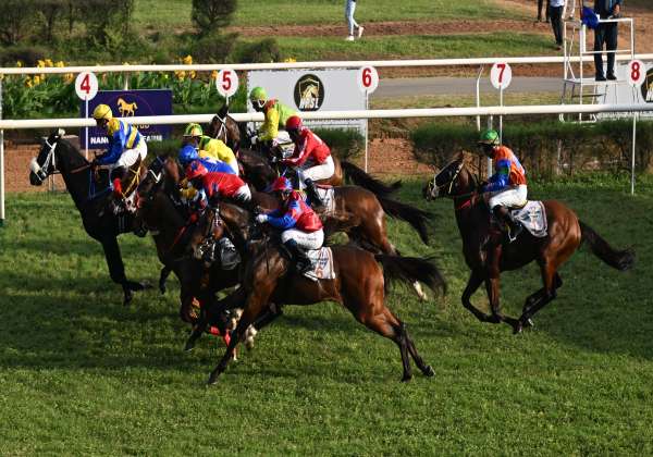 சென்னை ரேஸ்கோர்ஸ் மைதானத்தில் பொங்கல் திருநாளன்று நடைபெற்ற குதிரை பந்தயத்தில் சீறிப்பாய்ந்து சென்ற குதிரைகள்.