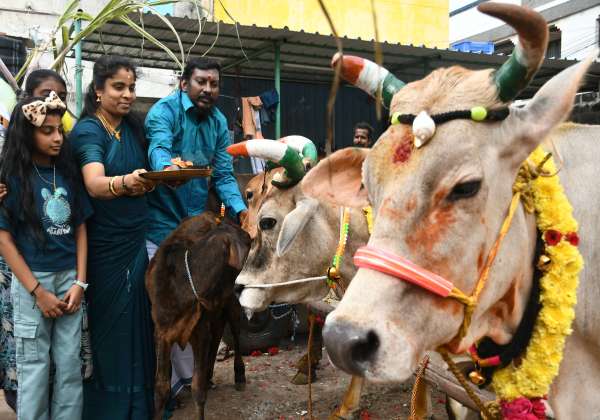 மாட்டுப் பொங்கலை முன்னிட்டு தங்களது மாடுகளுக்கு பூஜை செய்து வழிபட்ட உரிமையாளர்கள். இடம் : வால்டாக்ஸ் சாலை.
