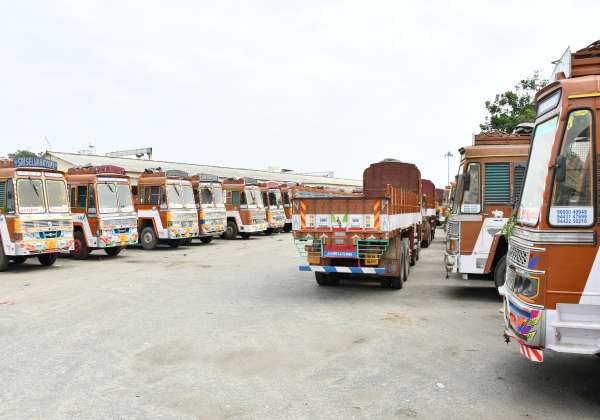பொங்கல் விடுமுறை, அணிவகுத்து நிற்கும் சரக்கு லாரிகள். இடம்: திருப்பூர், ரயில்வே கூட்ஷெட்