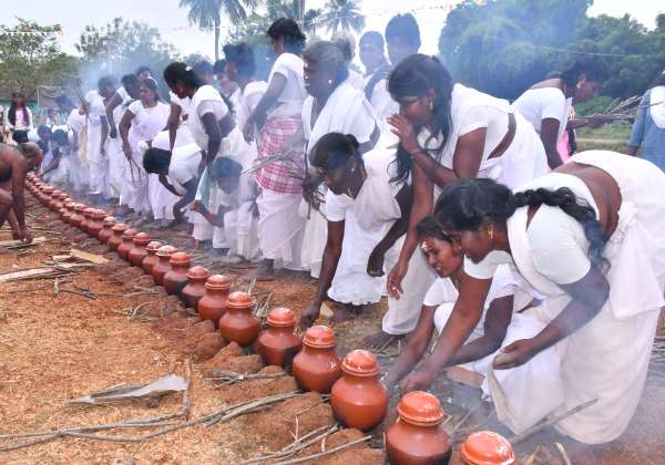 சிவகங்கை மாவட்டம் மதகுபட்டி அருகே சலுகைபுரம் கிராமத்து பெண்கள் பாரம்பரிய முறைப்படி வெள்ளை சேலை உடுத்தி பொங்கல் வைத்து கொண்டாடினர்.