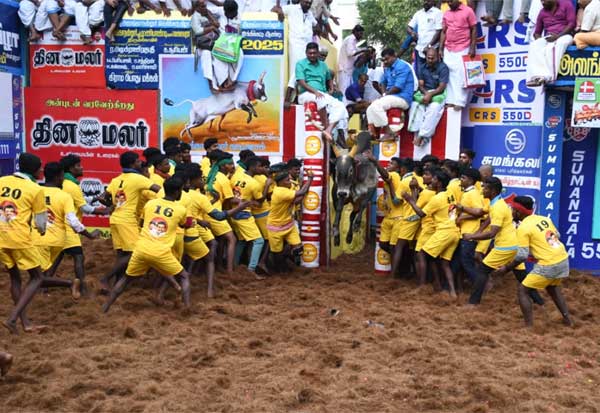 உலக புகழ் பெற்ற அலங்காநல்லூர் ஜல்லிக்கட்டு போட்டியில் வாடிவாசலில் இருந்து நான்கு கால் பாய்ச்சலாக சீறிவந்த காளை