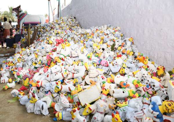 உடுமலை சோமவாரபட்டி ஆல் கொண்டமால் கோவில் திருவிழாவையொட்டி பக்தர்கள் நேர்த்திக் கடனாக செலுத்திய உருவார பொம்மைகள்.