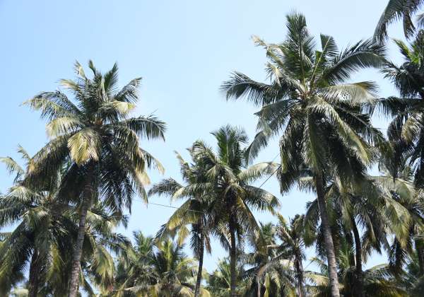 பொள்ளாச்சி அருகே தமிழக - கேரளா எல்லையில், கேரளா மாநிலத்தில் கள் இறக்க மரங்களுக்கு இடையே தொழிலாளர்கள் கயிறு கட்டியுள்ளனர்.