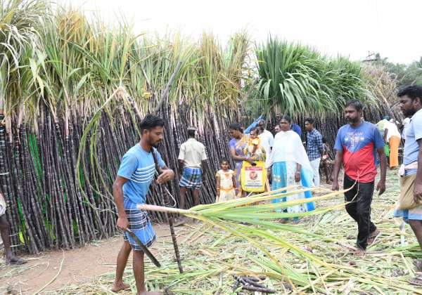 உடுமலை சோமவாரபட்டி ஆல் கொண்டமால் கோவில் திருவிழாவையொட்டி வீட்டிற்கு கரும்பு வாங்கி செல்லும் பக்தர்கள் .