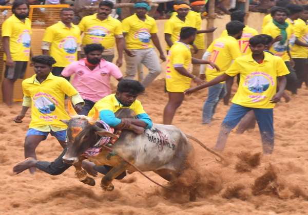 சிவகங்கை அருகே கண்டிப்பட்டி அந்தோணியார் கோயில் திருவிழாவை முன்னிட்டு நடந்த மஞ்சுவிரட்டில் சீறிப்பாயும் காளை.