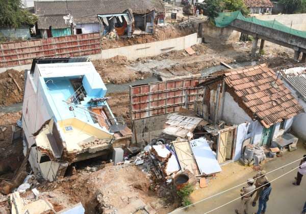 கோவை சிவானந்தா காலனி அருகே உள்ள அண்ணா நகரில் சங்கனூர் ஓடை அருகே இருந்த வீடு இடிந்து ஒடையில் விழுந்தது.