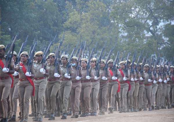 குடியரசு தினத்தை முன்னிட்டு கோவை பி. ஆர். எஸ். , மைதானத்தில் ஒத்திகையில் ஈடுபட்ட பெண் போலீசார்கள்.