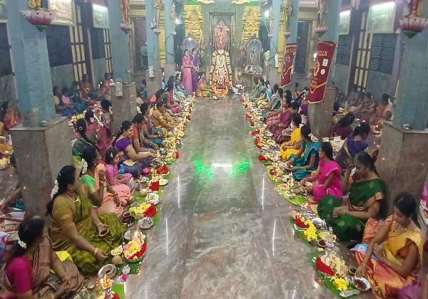 புதுச்சேரி வாசவி கன்னிகா பரமேஸ்வரி அம்மன் கோயிலில் குத்து விளக்கு பூஜை நடந்தது.