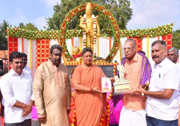 சிவகங்கை உதய தினம் விழாவில் வரலாற்று ஆய்வாளர் பாலகிருஷ்ணன் அவர்களுக்கு சமூகம் கலை இலக்கிய துறைகளில் சேவை புரிந்தமைக்கான சான்றிதழை பரம்பரை அறங்காவலர் மதுராந்தகி நாச்சியார் வழங்கினார்.இடமிருந்து செயலாளர் குமரகுரு ,மன்னர் பள்ளி, கல்வி நிறுவனங்கள் தலைவர் மகேஷ் துரை. தேவஸ்தான மேலாளர் இளங்கோ.
