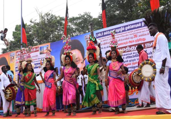 விழுப்புரம் அரசு நலத்திட்ட உதவிகள் வழங்கும் முதல்வர் ஸ்டாலின் வருகையை முன்னிட்டு புதிய பஸ் நிலையம் முன்பு கலை நிகழ்ச்சி நடந்தது.