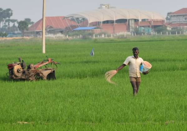 திருநெல்வேலி மாவட்டம் தருவை பகுதியில் வயல்களில் பயிரிடப்பட்டுள்ள நெற்பயிர்களுக்கு உரமிடும் பணியில் ஈடுபட்டுள்ள விவசாயி.