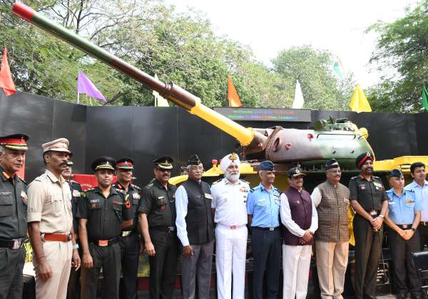38 ஆண்டுகள் இந்திய ராணுவத்தில் பயன்படுத்தப்பட்ட டி-55 மீடியம் டேங்க் மக்கள் பார்வைக்காக லெப்டினன்ட் ஜெனரல் கரன்பீர் சிங் ப்ரார் திறந்து வைத்தார் அருகில் ராணுவ அதிகாரிகள். இடம்: கோவை ரேஸ்கோர்ஸ் ரெட் பீல்டு ரோடு.