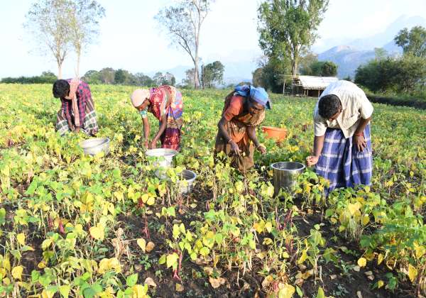 உடுமலை மாவட்ட மலை கிராமத்தில் பயிரிடப்பட்டுள்ள பீன்ஸ் செடிகளில் விளைந்த காய்களை பறிக்கின்றனர்.