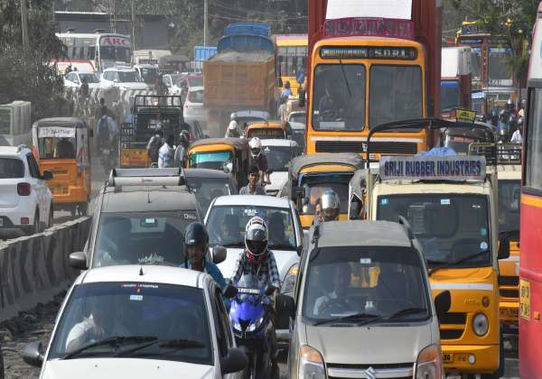 கோவை உக்கடம் - குறிச்சி பிரிவு இடையே ஏற்பட்ட போக்குவரத்து நெரிசல்.