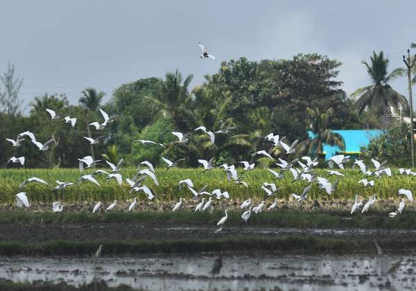 புதுச்சேரி அடுத்து பிள்ளையார் குப்பத்தில் உழவு செய்துள்ள நிலத்தில் இரைகளைத் தேடி வந்த கொக்குகள்.