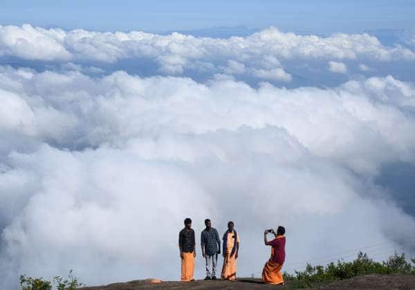 தேனி மாவட்டம் மேகமலையில் மேகங்களுக்கு மத்தியில் புகைப்படம் எடுக்கும் சுற்றுலா பயணிகள்.