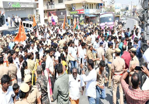 திருப்பரங்குன்றம் விவகாரம் தொடர்பாக, திருப்பூர் தாராபுரம் ரோடு ஹிந்து முன்னணி அலுவலகம் முன் மாநிலத்தலைவர் காடேஸ்வரா சுப்பிரமணியம் கைது செய்ததை கண்டித்து ரோடு மறியலில் ஈடுபட்ட தொண்டர்கள்.