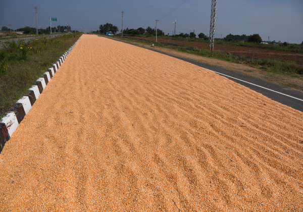 கோவை - திண்டுக்கல் நெடுஞ்சாலையில் உலர வைக்கப்பட்டுள்ள மக்காசோளம். இடம்: மடத்துகுளம்.