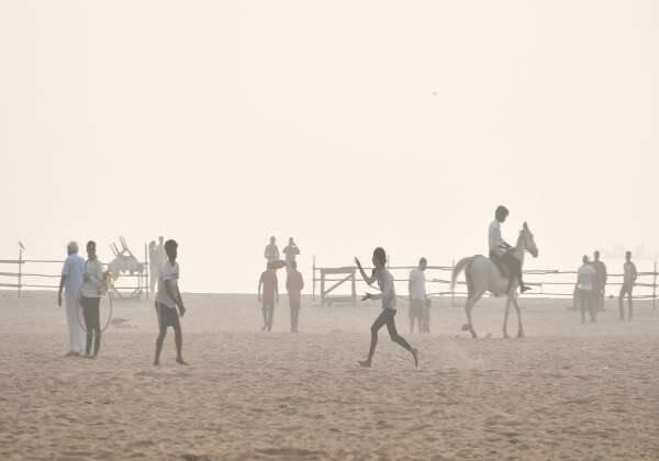 சென்னையில் அதிகாலையில் நிலவிய பனி மூட்டத்தால் கடற்கரை மணலில் வெள்ளை போர்வை போர்தியது போல் காட்சியளிக்கிறது. இடம் : எலியட்ஸ் கடற்கரை, பெசன்ட் நகர்.